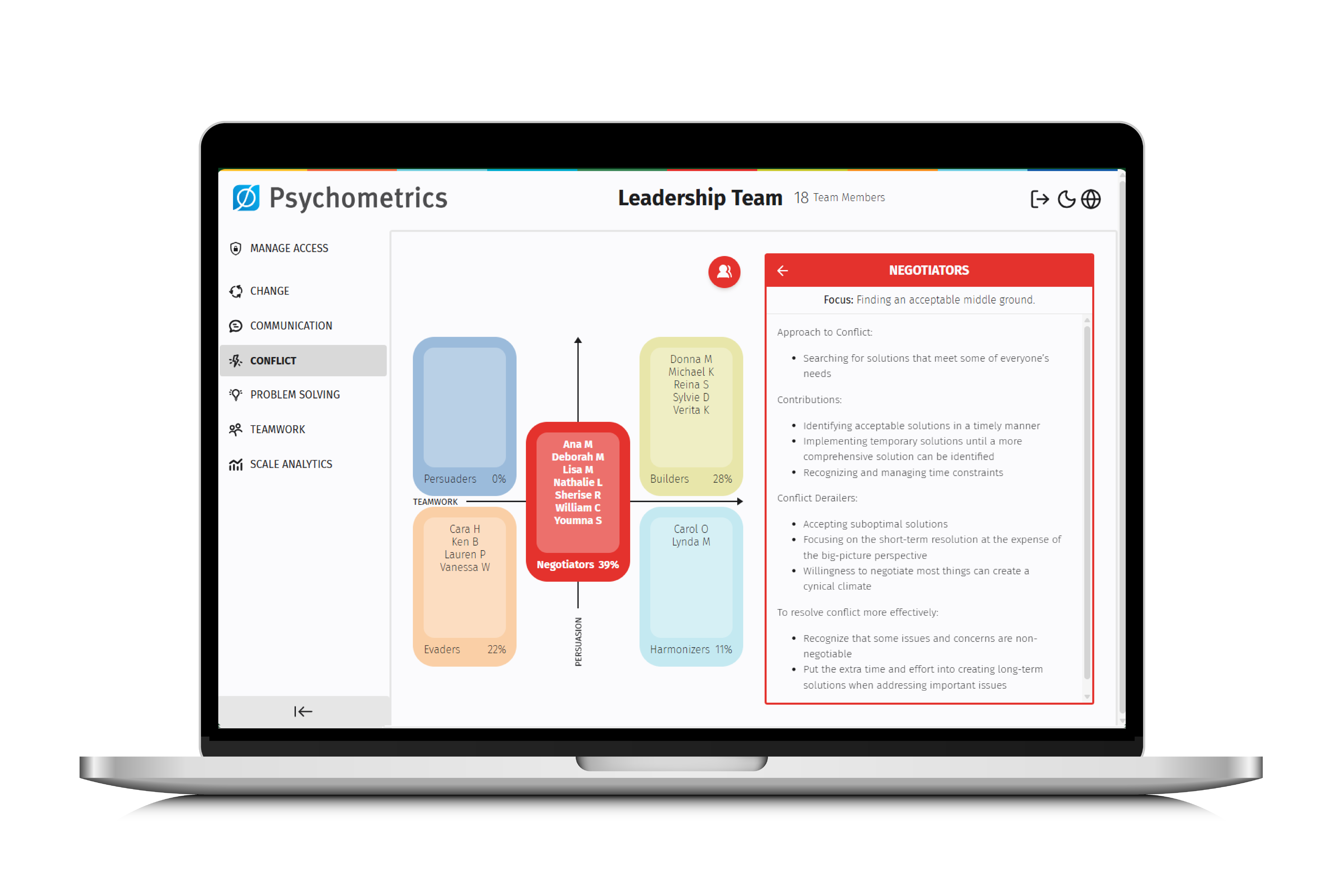 Analyze group data in key areas such as change management, communication style, conflict, problem-solving and teamwork. Team members and managers can visualize how their style compares to the group at large and learn about strengths and challenges.