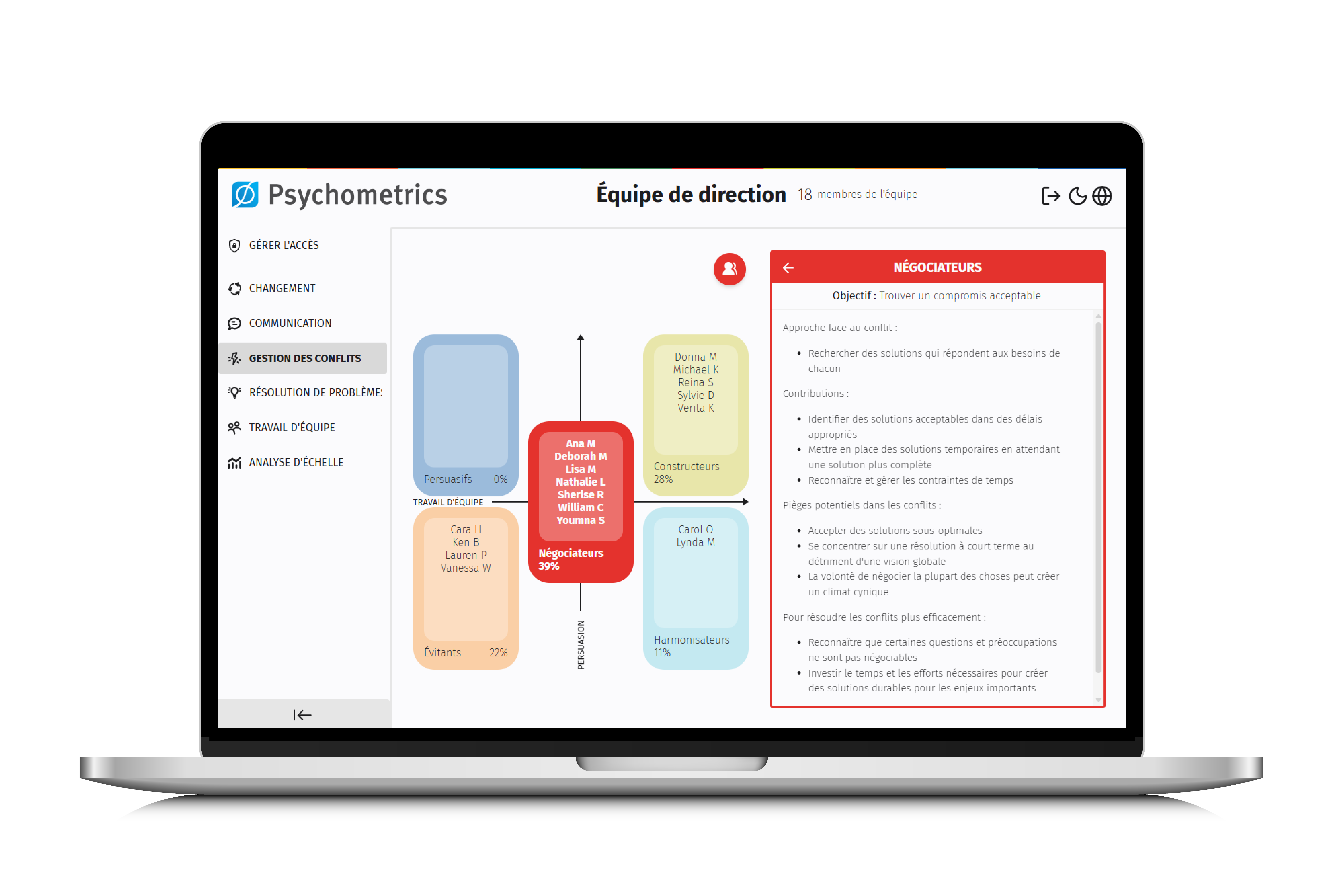 Analyse les données collectives dans des domaines clés tels que la gestion du changement, le style de communication, la gestion des conflits, la résolution de problèmes et le travail d’équipe.